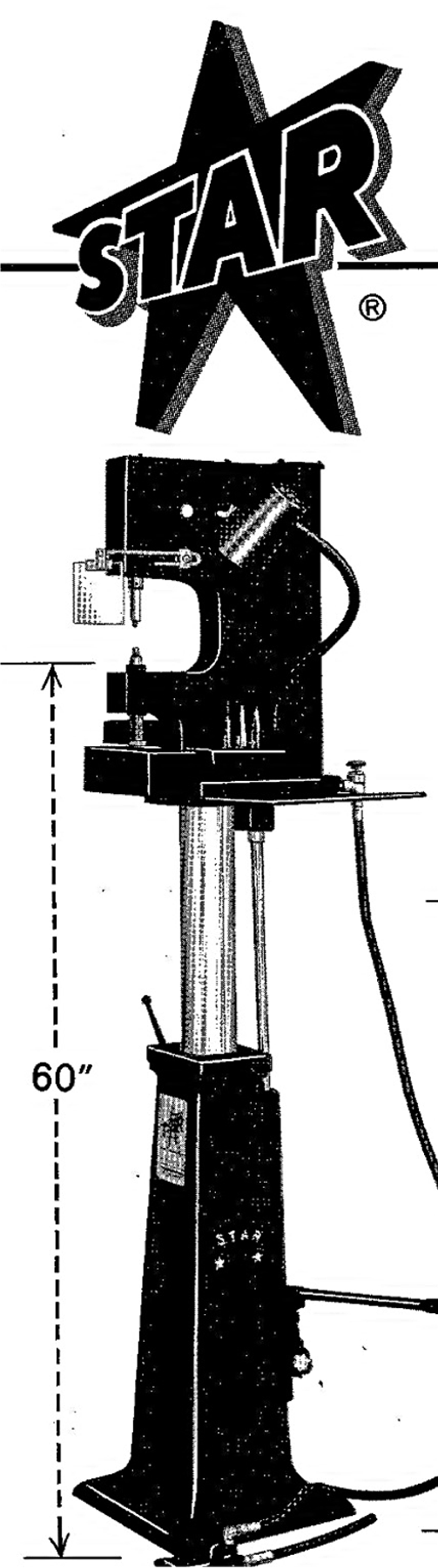 MOST POWERFUL INDUSTRIAL-AUTOMOTIVE RIVETER. HYDRAULIC-ADJUSTABLE RIVETING HEAD HEIGHT ONE NEW STAR MODEL 170V EXTRA HEAVY DUTY AIR POWERED RELINER FOR RELINING BRAKE SHOES AND CLUTCH PLATES, WITH A PEDESTAL MOUNTED COUNTERSINKER, 3” X 7.5’ GRINDER. COMPLETE WITH A ¾ HP MOTOR 115/230V, 60 HZ. SINGLE PHASE, 1725 RPM AND STANDARD TOOLING FOR 3,4,5,7,8, AND 10 SERIES RIVETS. ADJUSTABLE HEAD UP TO 60” CAN HANDLE 5 FOOT BRAKE BANDS.