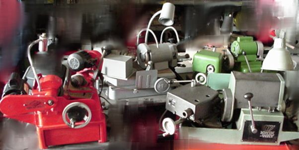 Tobin Arp grinder on the left. Kwik-Way grinders on the right, front and back. Sioux grinder in center rear.